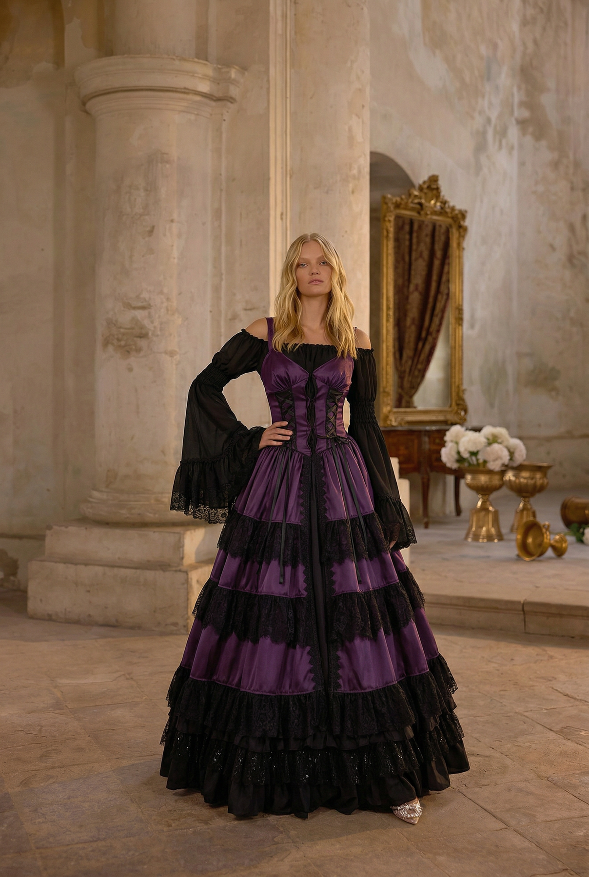 • Victorian-Inspired Corset Bodice: The fitted bodice features beautiful lace patterns, corset-style lacing, and delicate ruffle details that enhance your silhouette while adding a touch of historical elegance.