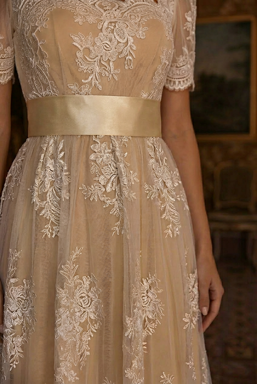 Designed with a classic empire waist silhouette, this Regency Era champagne lace empire waist gown enhances the natural waistline while preserving authentic Regency proportions. The short lace sleeves and scalloped neckline frame the décolletage with delicate detail, while the satin waistband adds gentle structure. The flowing skirt finishes with an ornate lace hem, allowing the gown to move beautifully with every step.