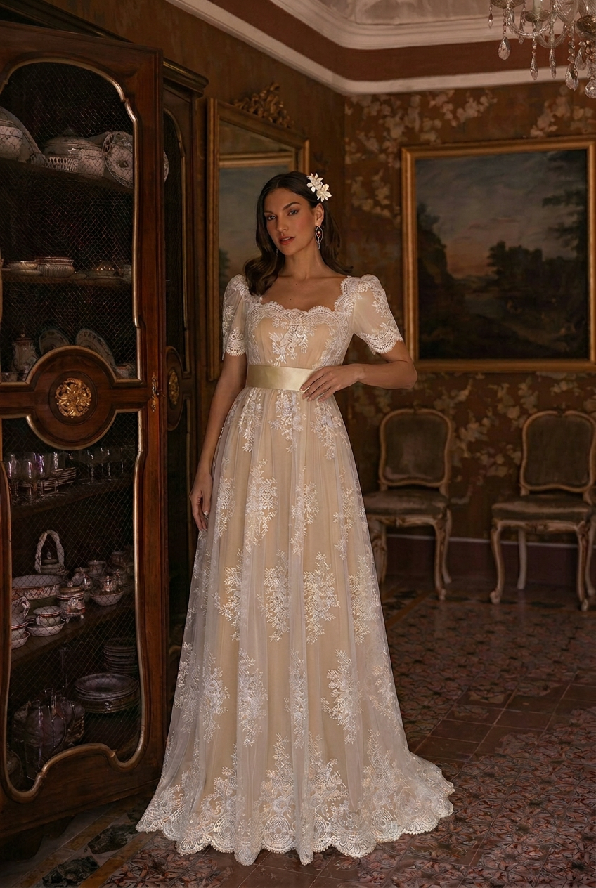 Graceful and softly radiant, this Regency Era champagne lace empire waist gown embodies the refined romance of early 19th-century fashion. The warm champagne underlayer paired with intricate ivory lace creates depth and dimension, offering a look that feels both timeless and effortlessly elegant.