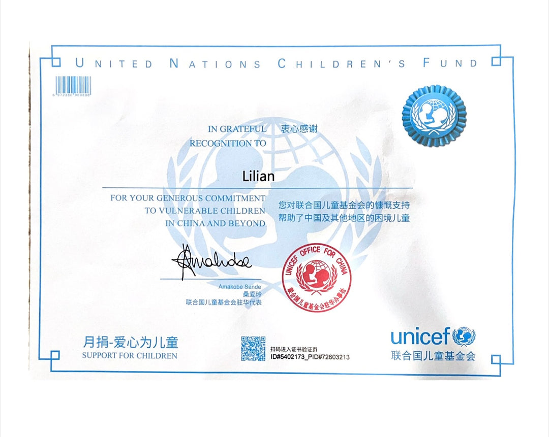 At WonderlandByLilian, we are committed to more than just fashion. Our founder, Lilian, has been recognized by UNICEF for her generous support of vulnerable children in China and beyond. This certificate represents our brand’s dedication to making a meaningful difference, one contribution at a time.