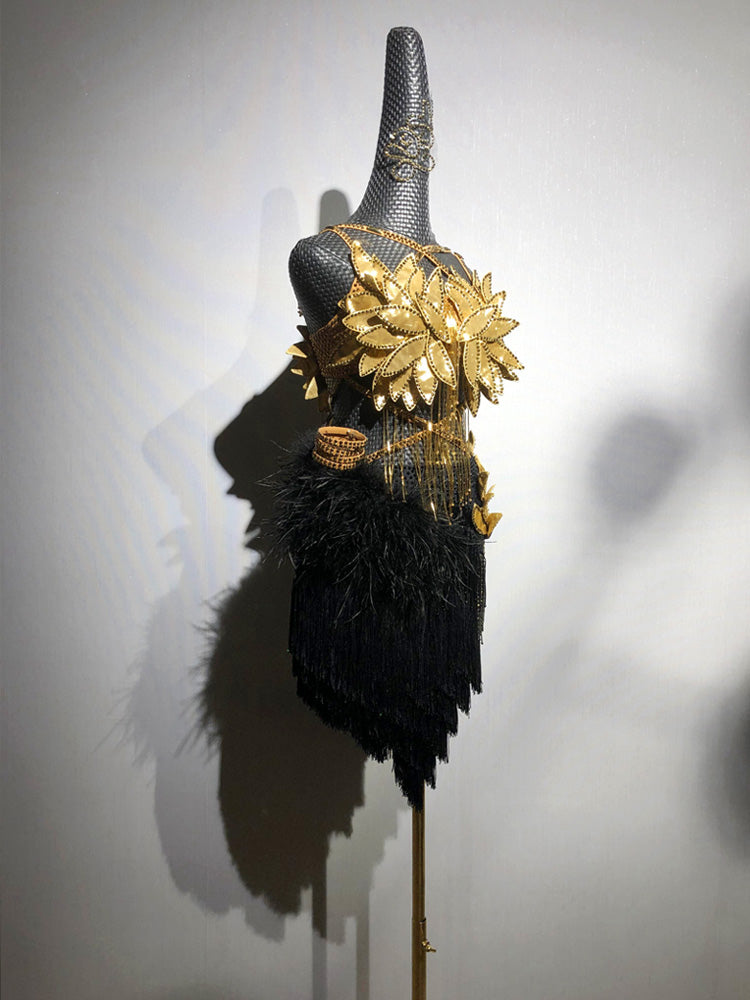 Step into the spotlight in this dazzling gold and black salsa dress designed to move with every beat. The nude illusion mesh base is richly adorned with handmade golden floral appliqués and shimmering beadwork. Dramatic layers of soft black feathers and flowing fringe add bold texture and high-impact movement, making it ideal for Latin dance styles including rumba, cha-cha, samba, paso doble, and jive.
