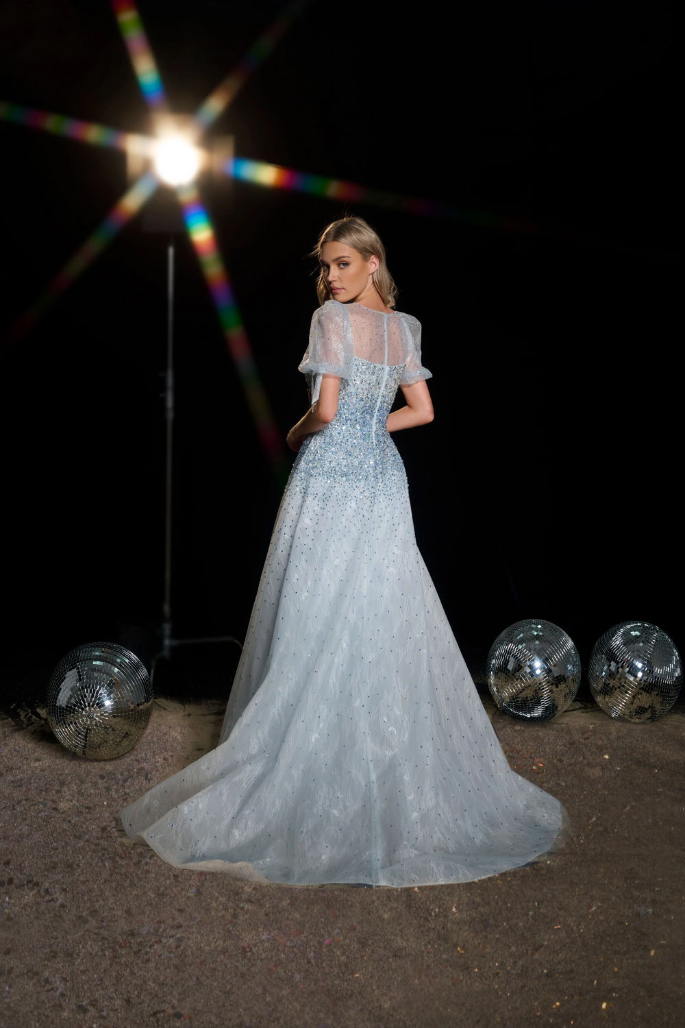 Step into a world of elegance with this stunning blue sequin ball gown, designed to captivate at any formal occasion. The dress features puff sleeves with delicate bow accents, adding a playful yet refined touch. The sweetheart neckline beautifully enhances the décolletage, while the shimmering sequins cascade throughout the gown for a dazzling effect.