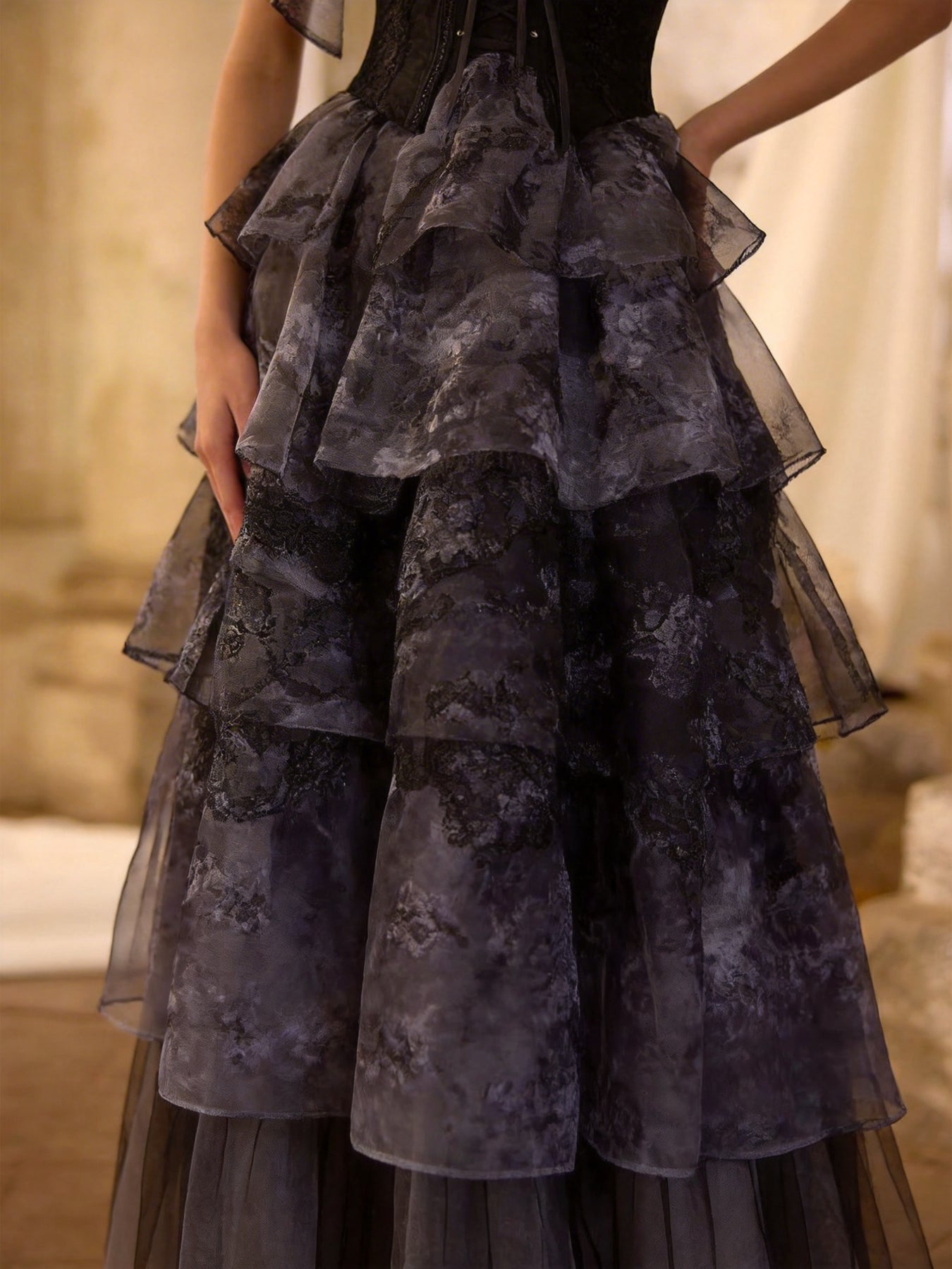 This Gothic corset evening dress blends sculpted structure with soft atmospheric movement. The fitted lace-up bodice defines the waist with architectural precision, while delicate straps and a sheer shoulder bow introduce a subtle romantic contrast.