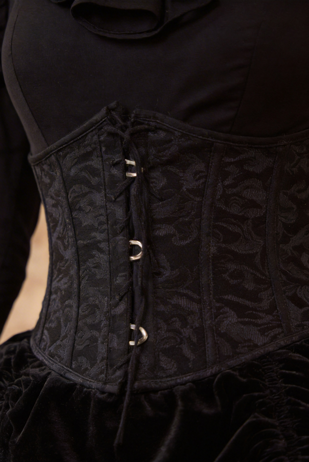 Satin with velvet draping and lace corset detailing