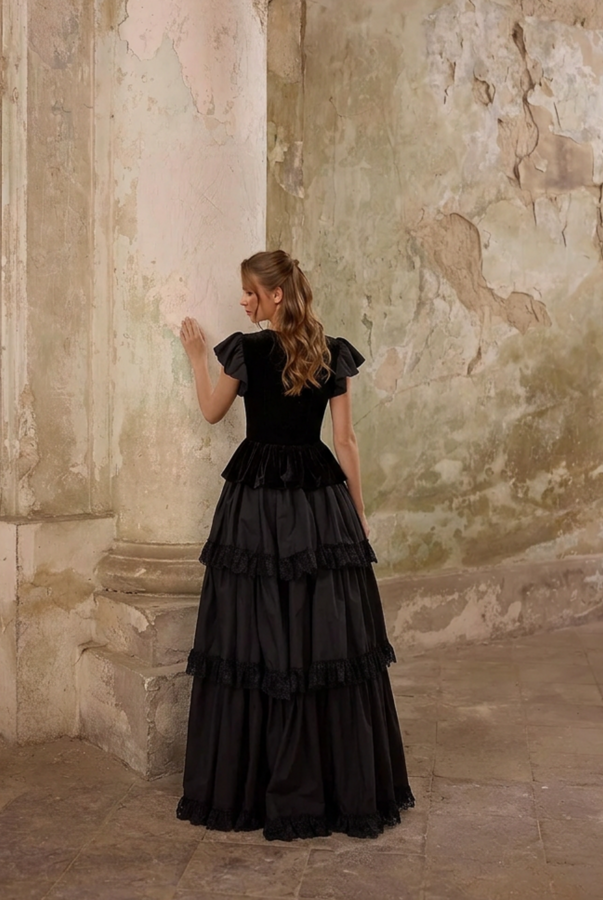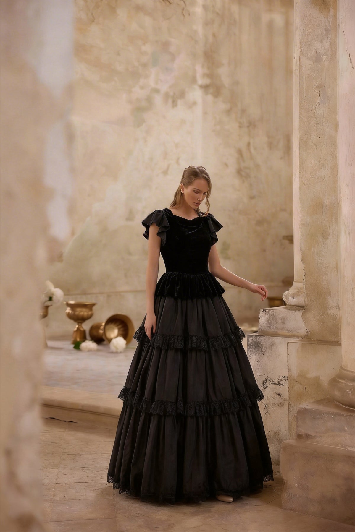 This Victorian black ball gown embodies quiet drama and refined structure. Designed with a sculpted bodice and soft ruffled cap sleeves, the silhouette balances romantic femininity with architectural presence.