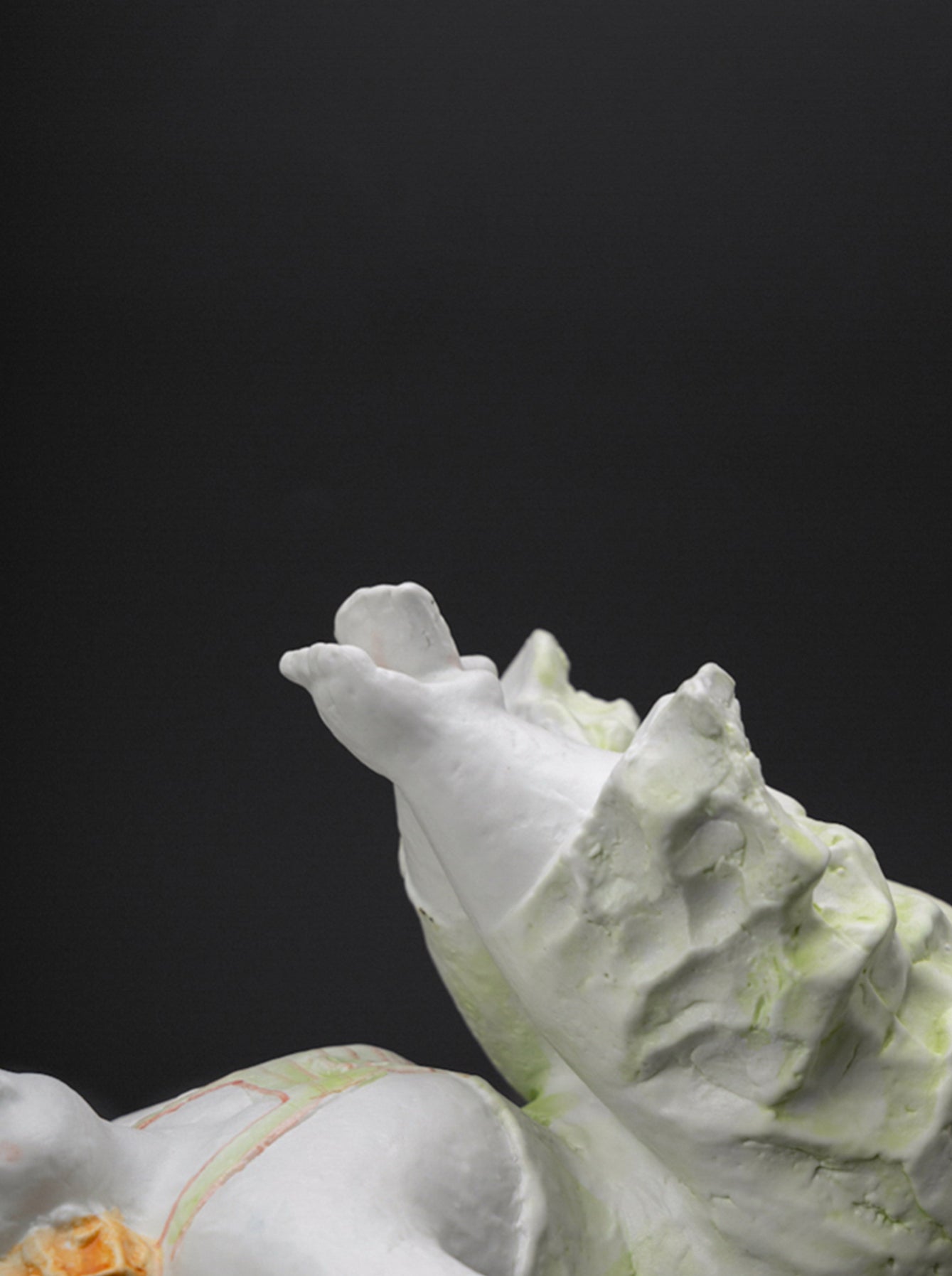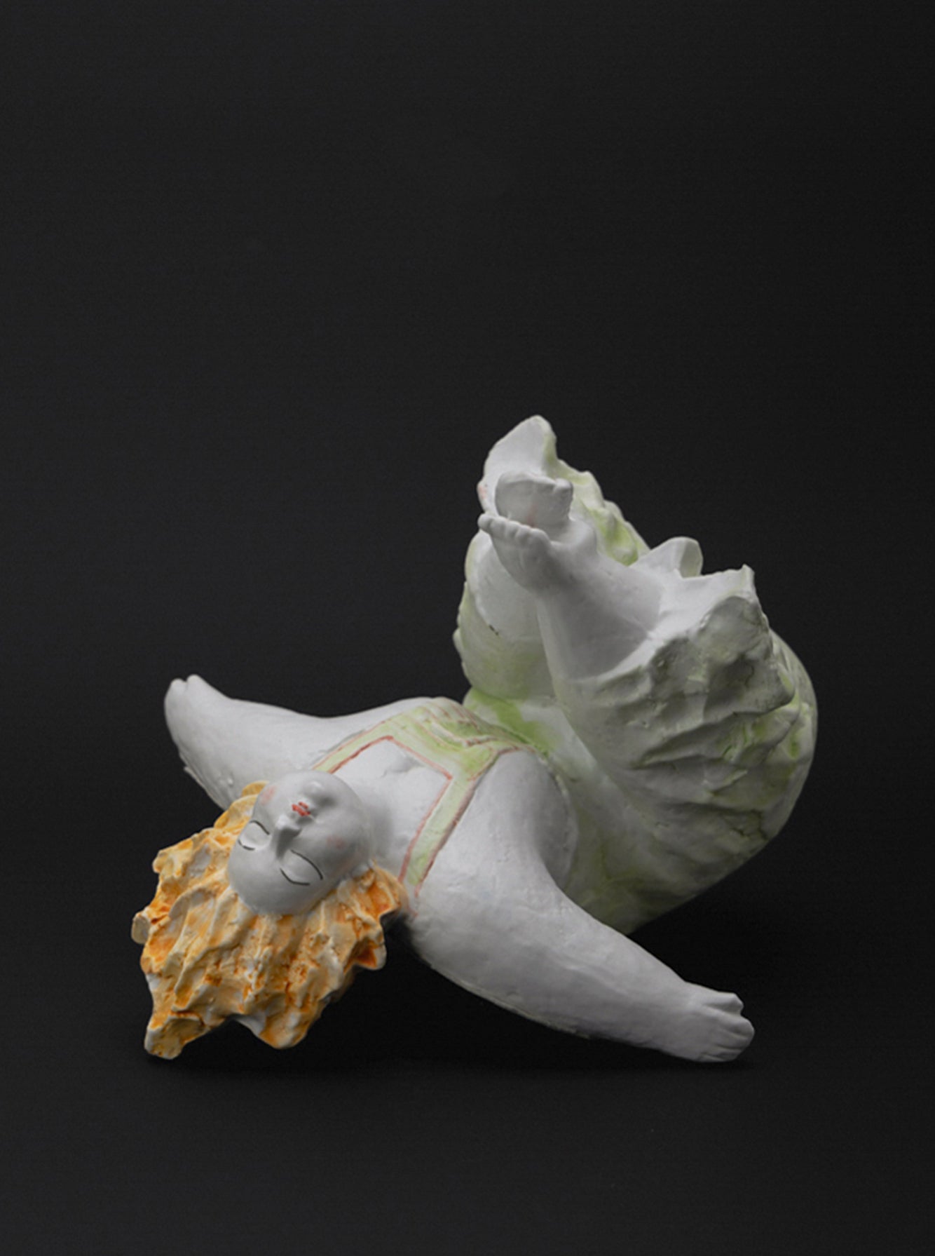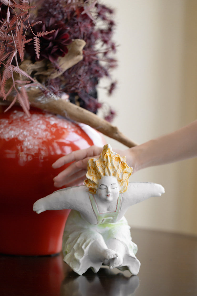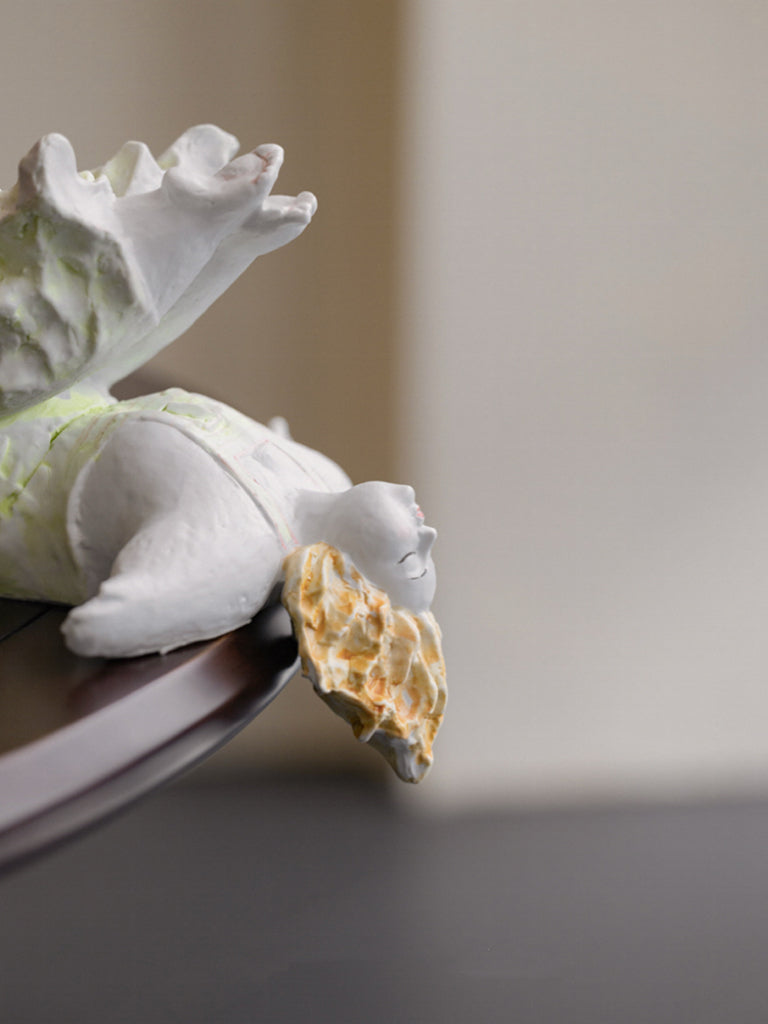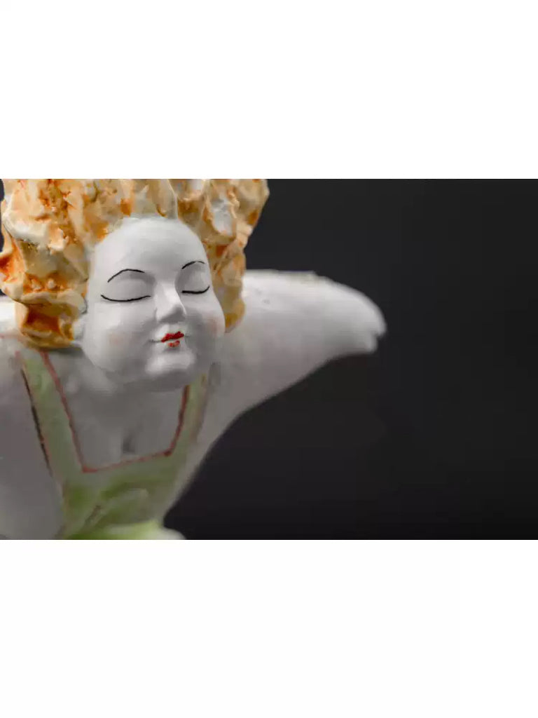 The figure, with golden cascading hair and a soft green dress, reclines in a state of ease and lightness — a sculptural moment of peace. Its matte glaze gives a gentle, refined glow, creating a timeless charm that feels both modern and vintage.