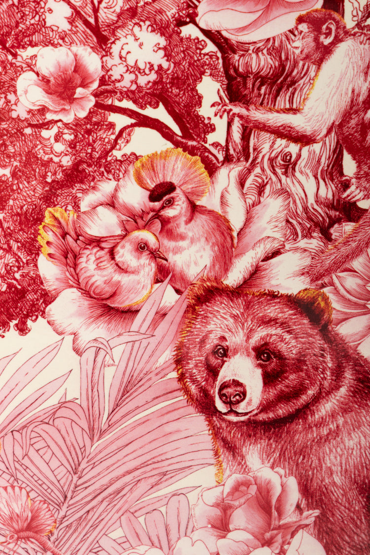 Bring the elegance of French artistry into your home with this exquisite Eden Toile painted wooden side table, inspired by Dior’s iconic pastoral motifs. Crafted from imported Russian birch wood, the tabletop is adorned with hand-screen-printed jungle scenes—monkeys in play, birds in bloom, and a gentle bear peeking through a forest of flowers.