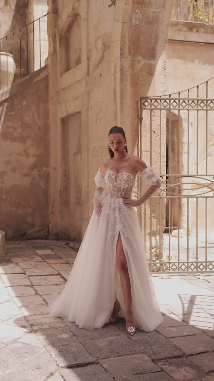 Embrace timeless elegance with this floral wedding dress featuring a high slit and an off-shoulder design. The bodice is adorned with intricate floral lace, creating a romantic and delicate look. The off-shoulder neckline beautifully frames your collarbone and shoulders, adding a touch of allure. The light, flowing skirt is designed with a high slit, bringing a modern twist to the classic silhouette and allowing for ease of movement. The corset-style bodice with a lace-up and zipper closure ensures a flattering fit, accentuating your natural curves. For added versatility, this dress includes removable sleeves, letting you customize your look to suit different moments of your special day. This gown combines the perfect blend of classic beauty and contemporary style, making it an unforgettable choice for your wedding.