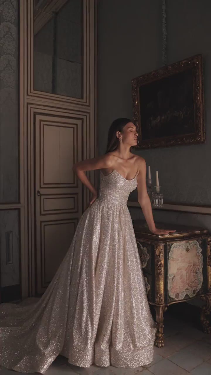 Featuring a timeless strapless neckline, this dress beautifully accentuates the shoulders and décolletage, offering a classic and elegant look. The bodice is expertly adorned with sparkling sequins, ensuring you shine from every angle. The full A-line skirt flows gracefully into a luxurious train, adding a dramatic flair to your bridal ensemble.