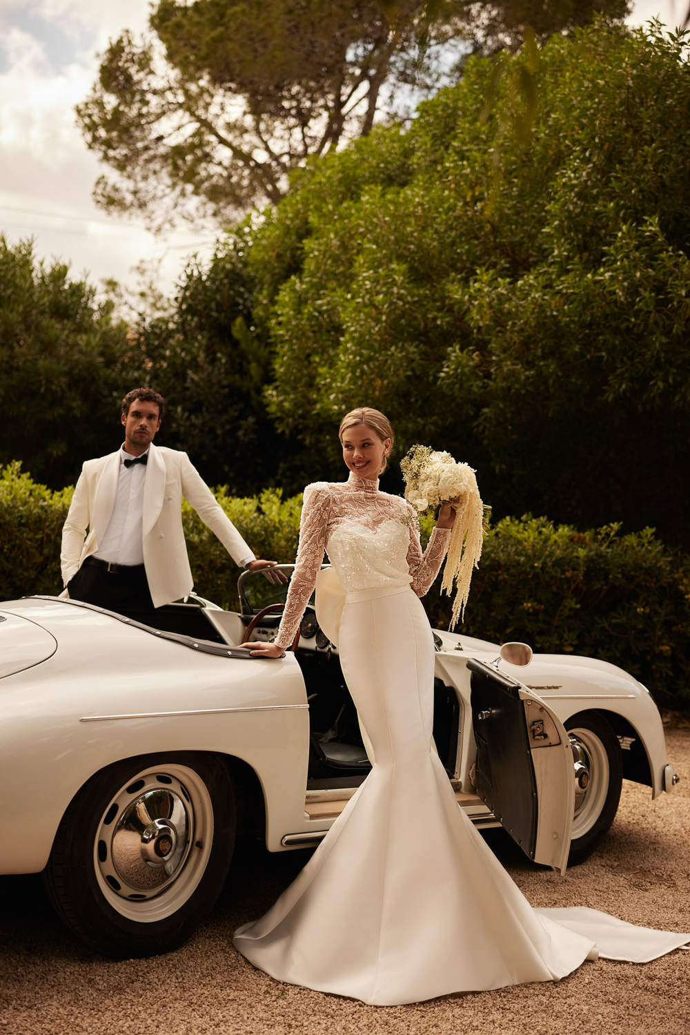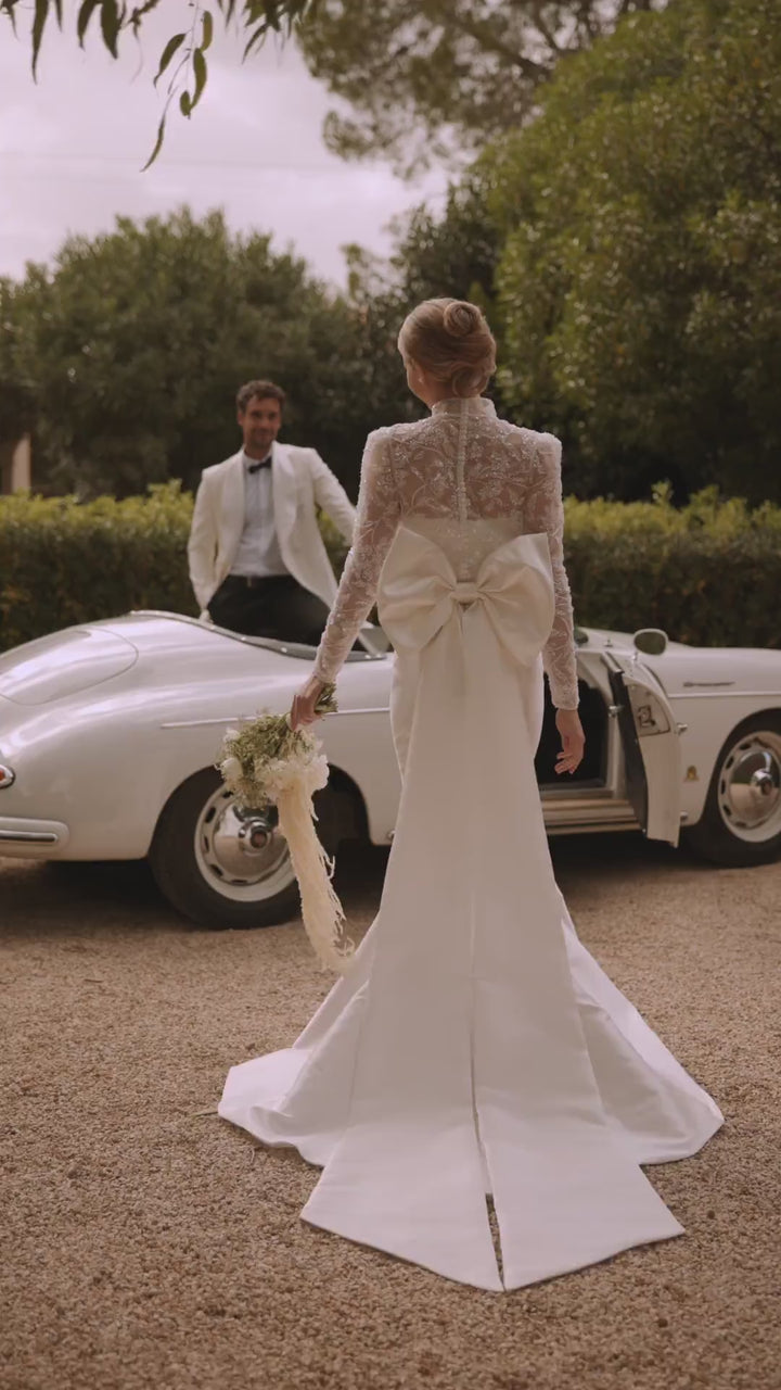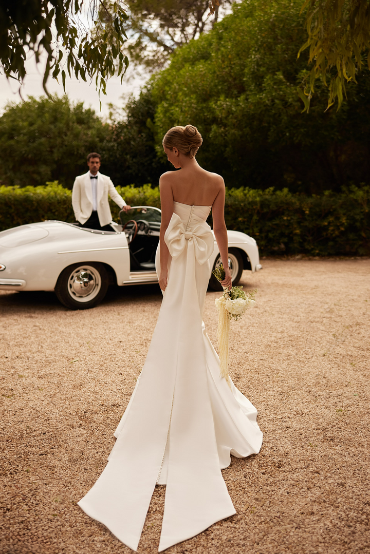 • Elegant mermaid cut sculpts the silhouette, finished with a smooth satin train