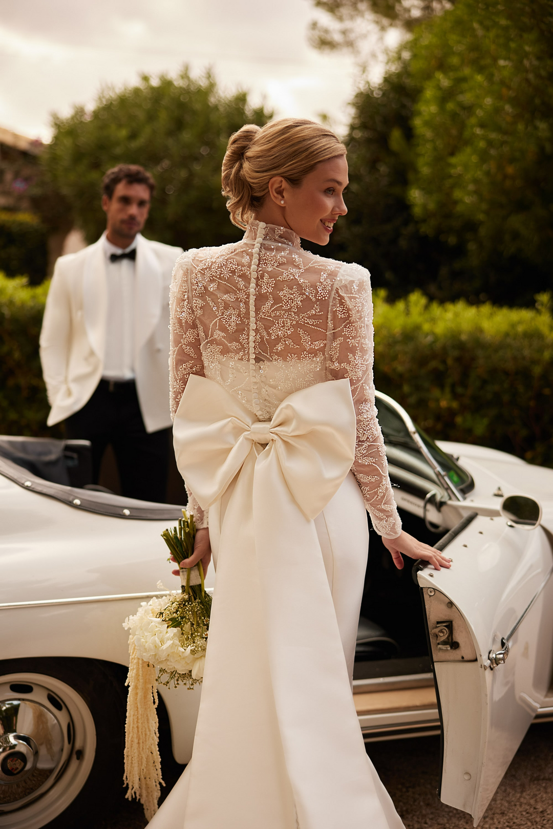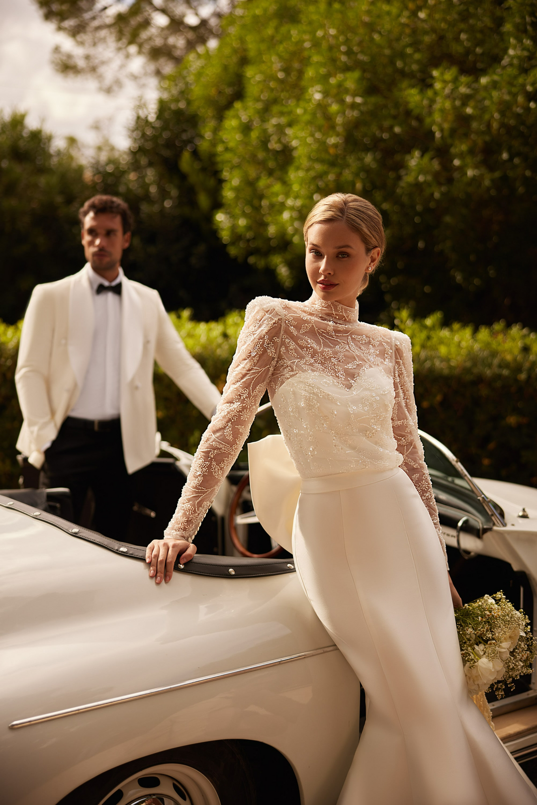 • Detachable lace overlay with long sleeves and high neckline for ceremony-to-reception versatility