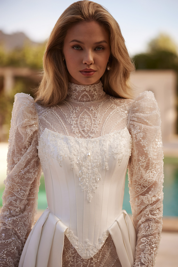• Elegant high neck and puffed shoulders for a regal silhouette