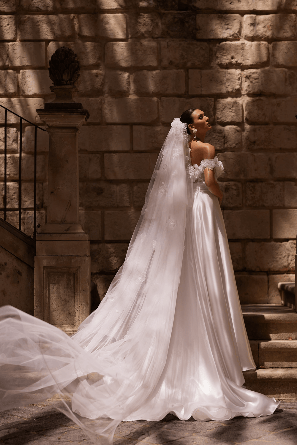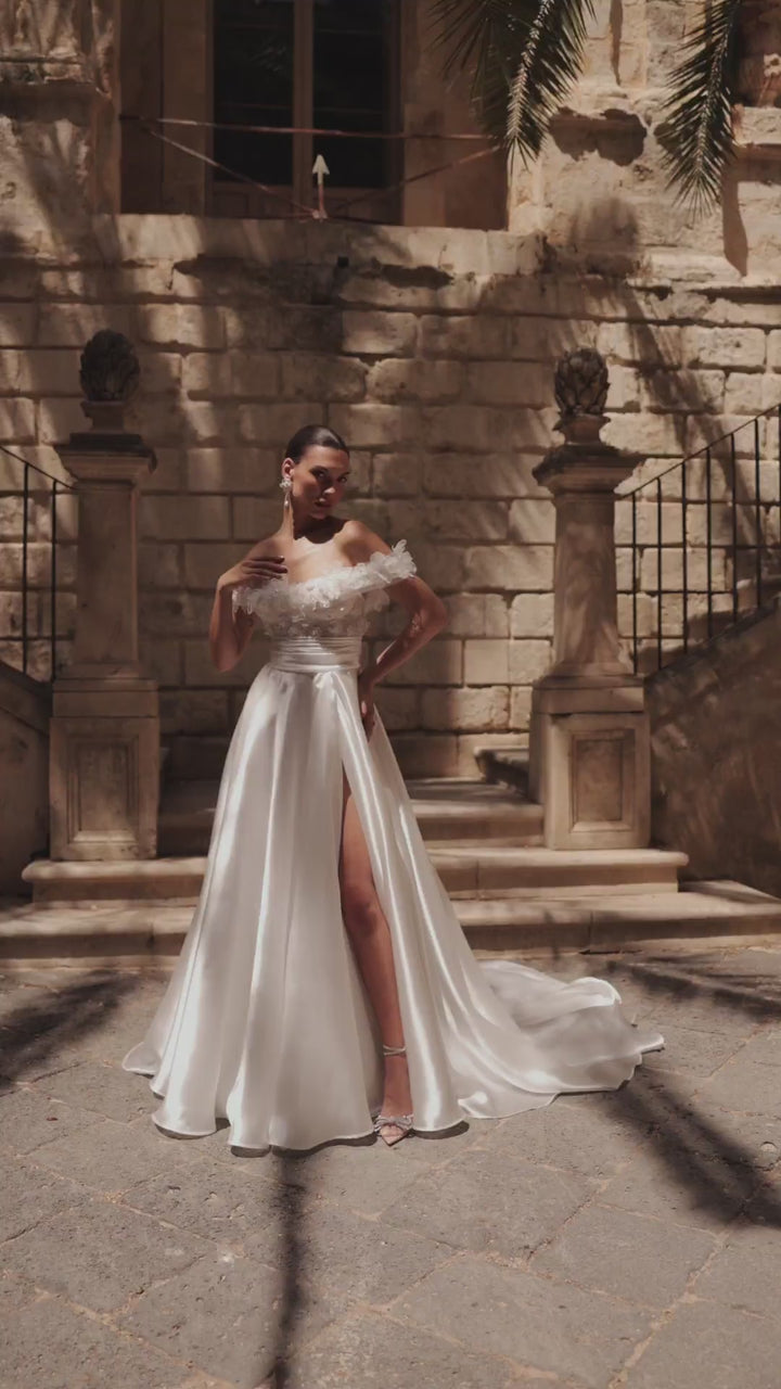 The off-the-shoulder neckline beautifully frames your shoulders and décolletage, adding a romantic and timeless appeal. Delicate semi-transparent floral appliqués adorn the neckline, enhancing the gown's ethereal beauty. The flowing satin skirt is gracefully designed, featuring a daring thigh-high slit that adds a hint of allure and makes movement effortless.