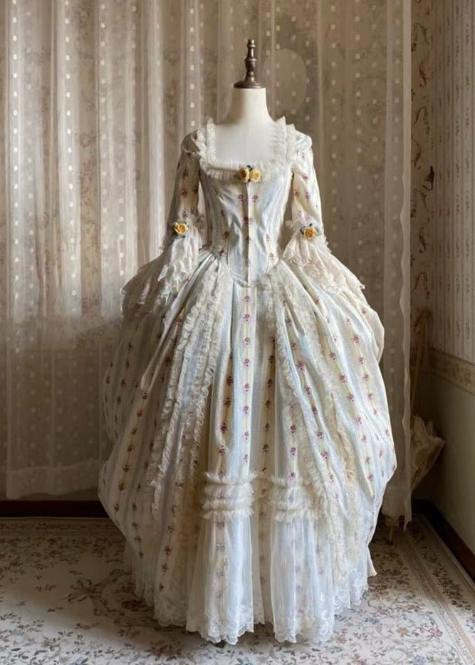 • Rococo and Baroque Fusion: This gown beautifully combines Rococo and Baroque styles, featuring intricate lace detailing and a lavish full skirt.