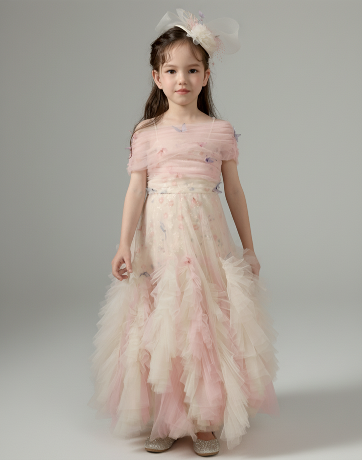 This blush pink tulle flower girl dress captures the magic of a fairytale moment, designed for weddings, birthdays, and other cherished celebrations. The off-shoulder neckline paired with delicate straps adds a graceful silhouette, while layers of airy tulle cascade into a voluminous skirt. Butterfly appliqués dance across the gown, bringing a whimsical, romantic touch that delights at every angle.
