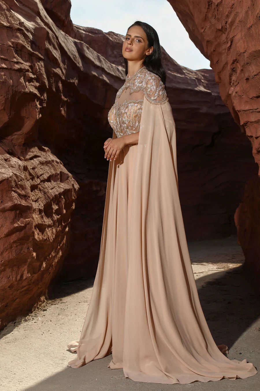 • Cape Sleeves: The floor-length chiffon cape sleeves drape elegantly, providing a dramatic and graceful effect.