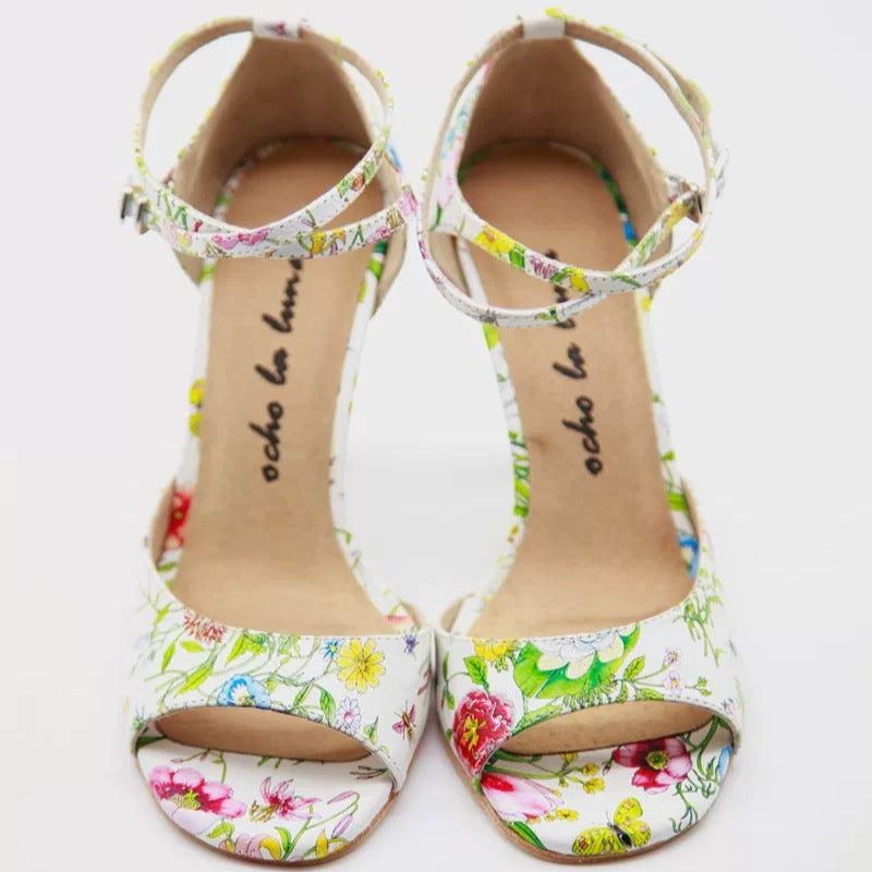 Handmade with printed sheepskin leather and finished with a graceful double ankle strap, these tango shoes offer both elegance and stability. Whether you're moving through a milonga, a summer wedding, or an outdoor portrait session, they carry you with lightness and clarity — like music translated through motion.