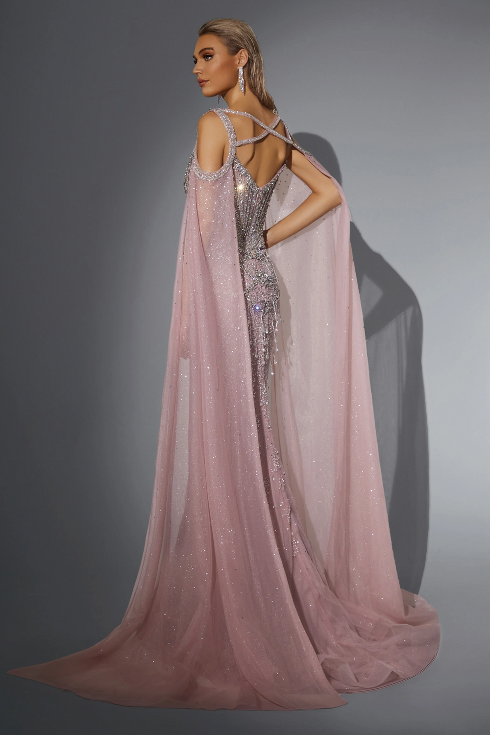 Turn heads in this Blush Pink Sparkly Maxi Dress, a dazzling choice for elegant occasions. Featuring cape sleeves that flow gracefully, this gown offers a striking combination of sophistication and modern charm. The cut-out back detail adds a touch of allure, while the blush pink hue exudes femininity and grace.