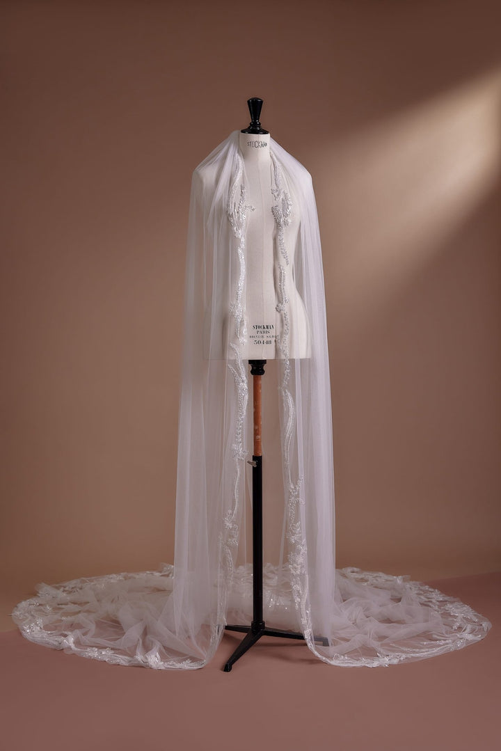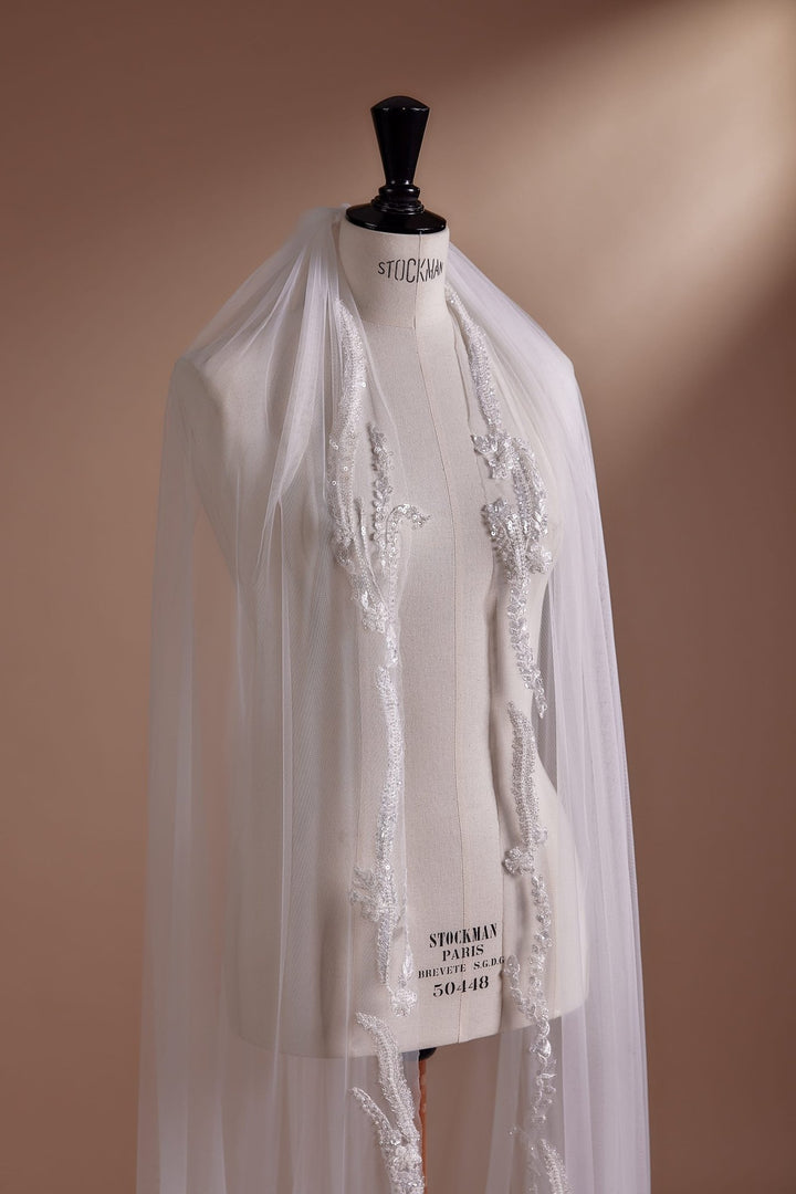 This veil is perfect for brides who want to make a grand entrance with a blend of tradition and modern elegance. The detailed lace and embroidery ensure you feel truly special as you walk down the aisle.