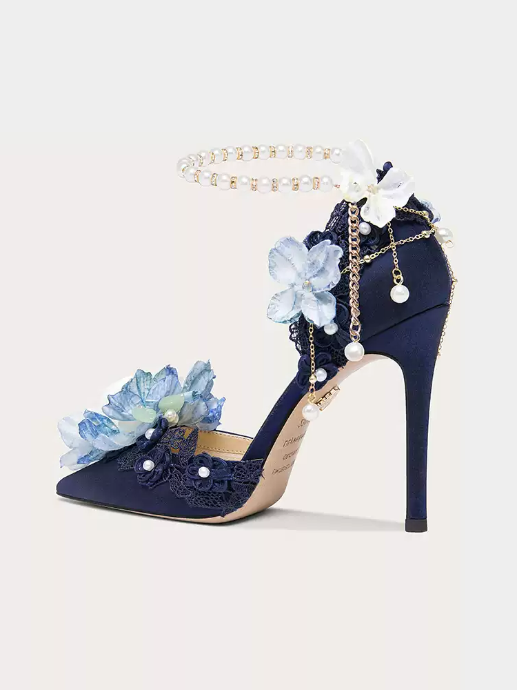 Elevate your gothic bridal or elegant event look with these captivating deep blue high heel sandals. Designed with intricate floral appliqués, pearl accents, and delicate beadwork, these pointed-toe sandals exude vintage-inspired charm. The mid-side cutouts and one-strap buckle closure add a contemporary touch, perfectly balancing style and practicality.