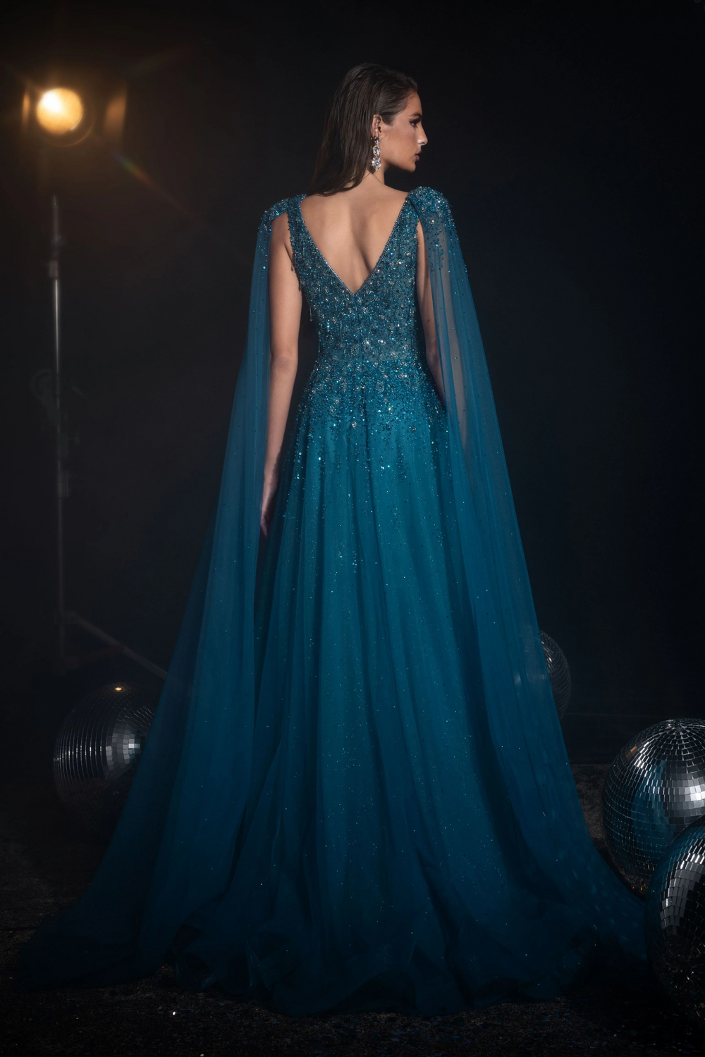 Ideal for proms, galas, or special occasions, this designer sequin gown combines gothic allure with modern elegance. The deep V-neckline and open back add a hint of allure, while the cape sleeves ensure a dramatic entrance.