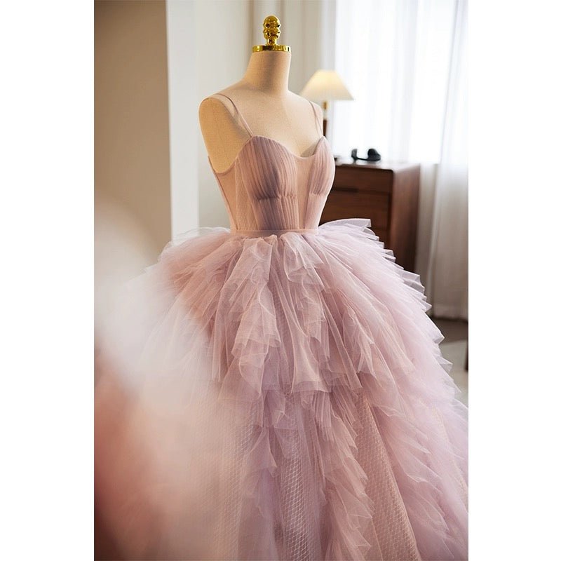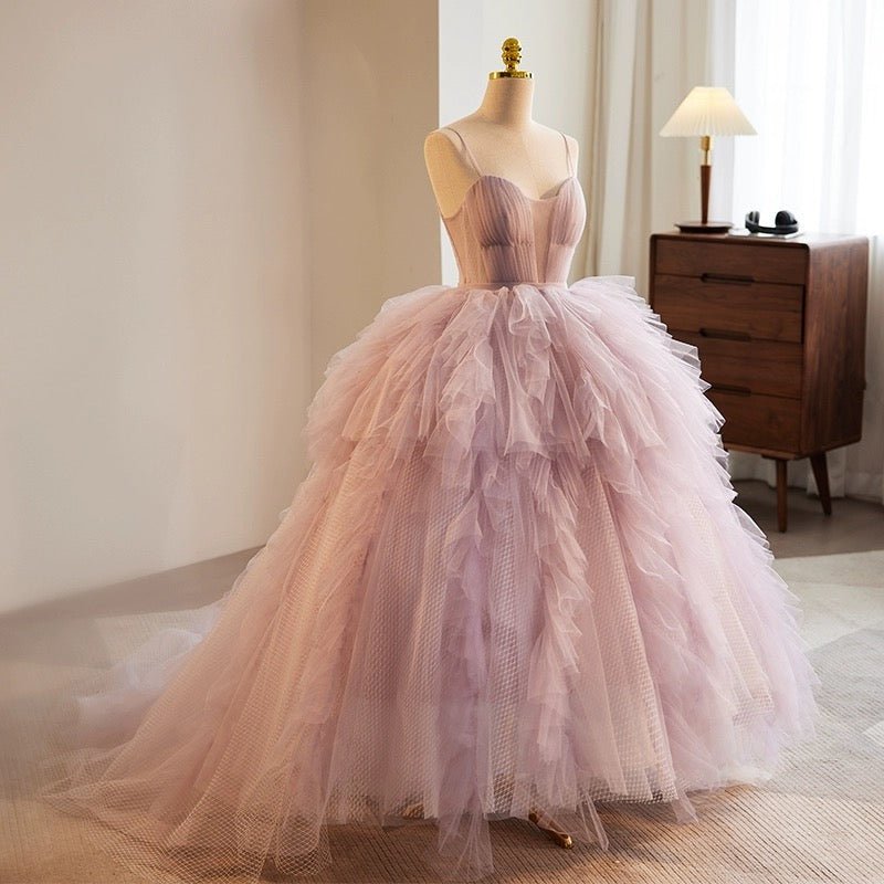 Step into a fairytale with our Purple Tulle Party Dress. This exquisite gown features delicate layers of tulle that create a voluminous, dreamy skirt, perfect for your special day. The spaghetti straps and sweetheart neckline enhance the elegance of the fitted bodice, while the purple corset back ensures a tailored and comfortable fit.