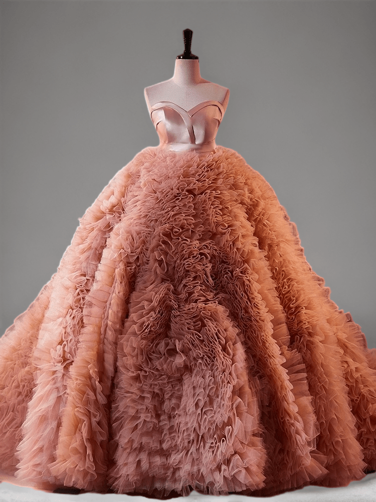 Ideal for weddings, formal events, and grand celebrations, this gown exudes warmth, friendliness, and sophistication. The romantic rose pink color adds a touch of timeless elegance, making you the focal point of any occasion. Embrace the charm and grace of this exquisite dress and let its luxurious details elevate your special moments.