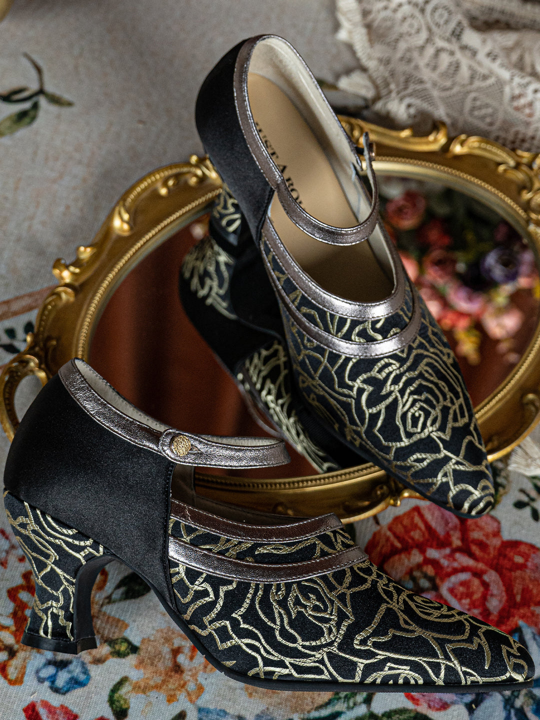 Handmade Regency Black and Gold Genuine Leather Embroidered Satin Heels