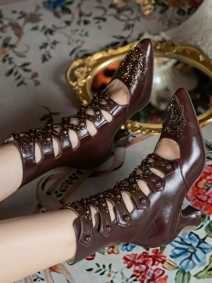 Handmade Victorian Brown Oil-Waxed Cowhide Leather Cutout Mid-Calf Boots with Beaded Embroidery