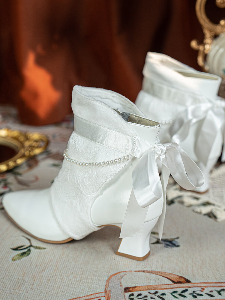 Handmade Regency White Lambskin Leather Ankle Boots with Lace and Pearl Trim