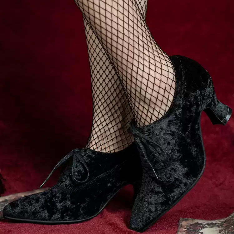 Introducing  Handmade Gothic Lace-Up Heels, a pair of handmade Victorian-style heels designed to evoke a bygone elegance. Whether rendered in soft black velvet cowhide or gleaming diamond-sheen leather, each version offers a timeless silhouette with modern comfort beneath its vintage soul.