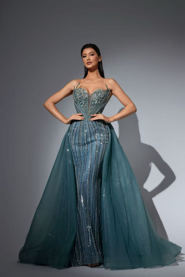 Radiate sophistication in this breathtaking blue sequin ball gown, designed to shimmer with every movement. Featuring a strapless corset-style bodice with intricate beadwork and sequins, this gown sculpts the figure while offering an elegant and confident silhouette. The detachable overskirt adds a dramatic touch, flowing gracefully for a true ball gown effect, making it perfect for weddings, galas, and red-carpet occasions.