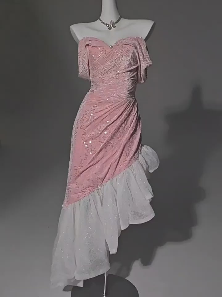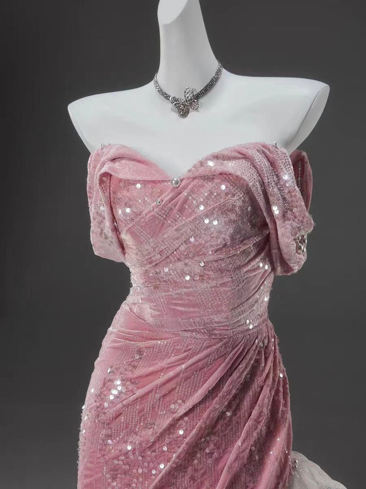 Elevate your evening wardrobe with this stunning blush pink and white sequin evening gown. Featuring an off-the-shoulder design, this gown is elegantly draped to flatter your figure while providing a touch of romance. The soft pink bodice is adorned with sparkling sequins, flowing into a dramatic white tulle skirt that adds a whimsical flair. Ideal as a plus size whimsical fairy inspired dress, this gown is perfect for proms, galas, or special occasions where you want to shine. Experience the elegance and charm of this remarkable gown, ensuring you feel beautiful and confident on your special day.