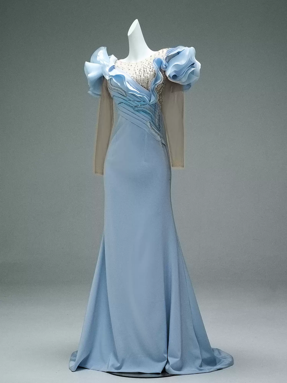 Grace the night with this stunning light blue mermaid evening dress, designed to flatter and captivate. The fitted silhouette features a beaded sheer bodice, dramatic ruffled shoulders, and delicate long sleeves, adding elegance and modern flair. Soft ruching along the bodice accentuates the figure, while the lace-up back ensures a perfect, adjustable fit.
