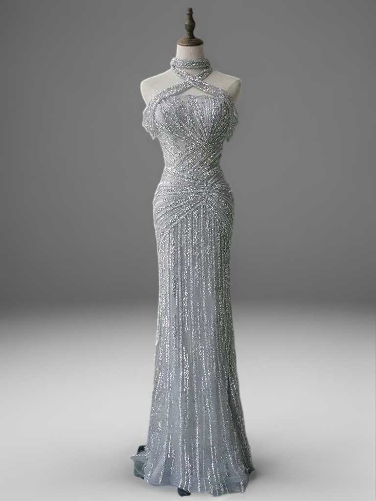 Sleek, radiant, and unforgettable — this silver sequin evening gown with crisscross halter neck is made to light up every room you enter.