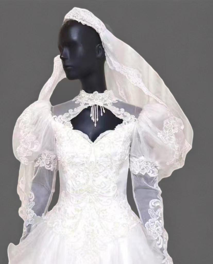 This breathtaking Victorian-inspired wedding gown is perfect for the bride who seeks drama and elegance on her special day. Crafted from layers of delicate tulle, the gown features a fitted bodice adorned with intricate lace appliqués and shimmering beadwork that adds a touch of regal sophistication. The off-shoulder puff sleeves and high lace collar evoke a sense of timeless romance. The voluminous skirt cascades into flowing, layered ruffles, creating a cloud-like silhouette that moves gracefully with each step. Accompanied by a matching lace-trimmed veil, this gown is ideal for a fairytale wedding or an opulent ceremony, ensuring a majestic and unforgettable appearance.