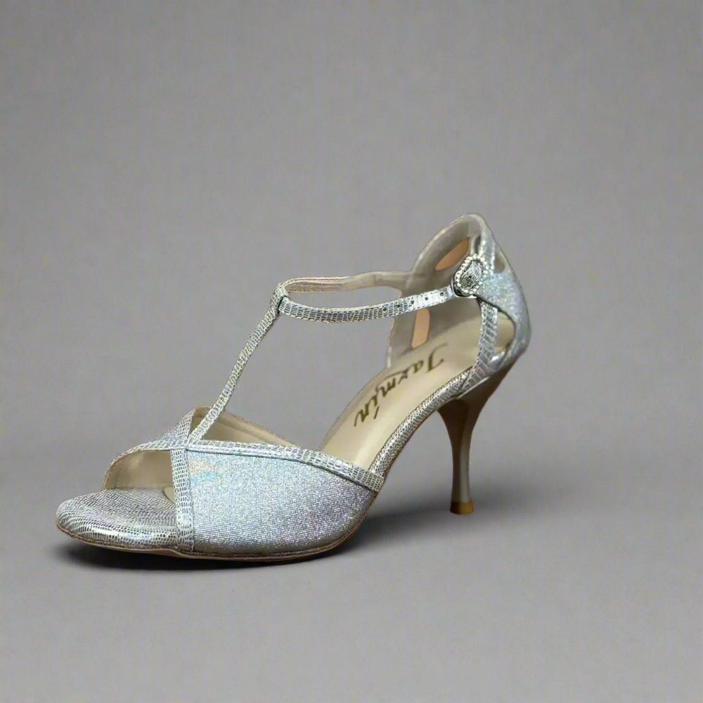 Handmade Tango Lambskin Leather Silver Latin Dance Shoes with T-Strap Design – Glitter Leather Ballroom and Latin Dance Shoes
