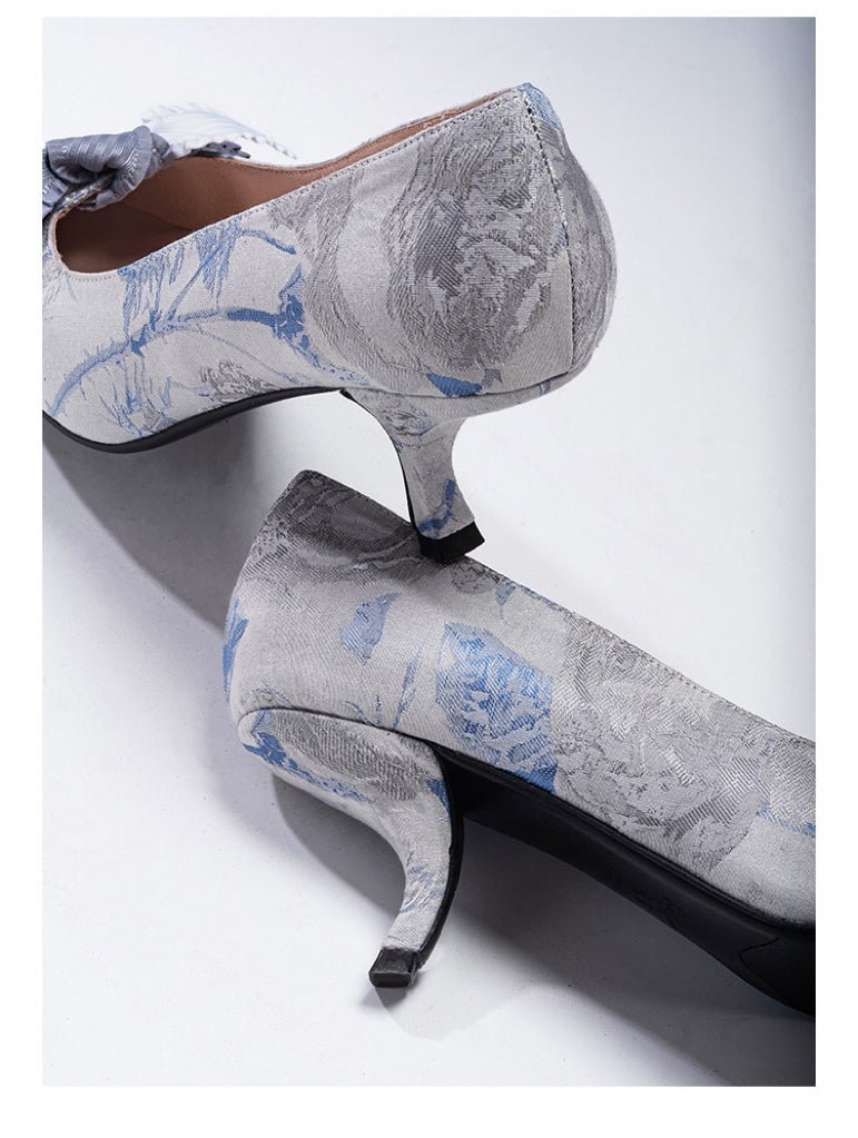 • Elegant Design: Featuring a luxurious brocade fabric in blue and grey tones, these heels are adorned with delicate floral patterns that capture the essence of Regency elegance.