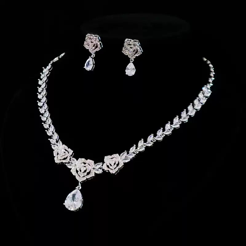 Silver Floral Zircon Jewelry Set - Bridal Necklace and Earrings Set