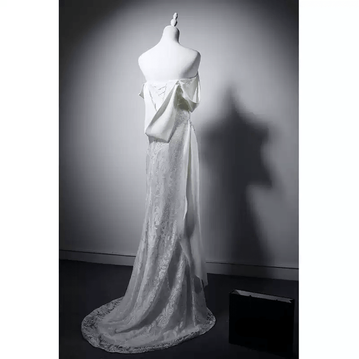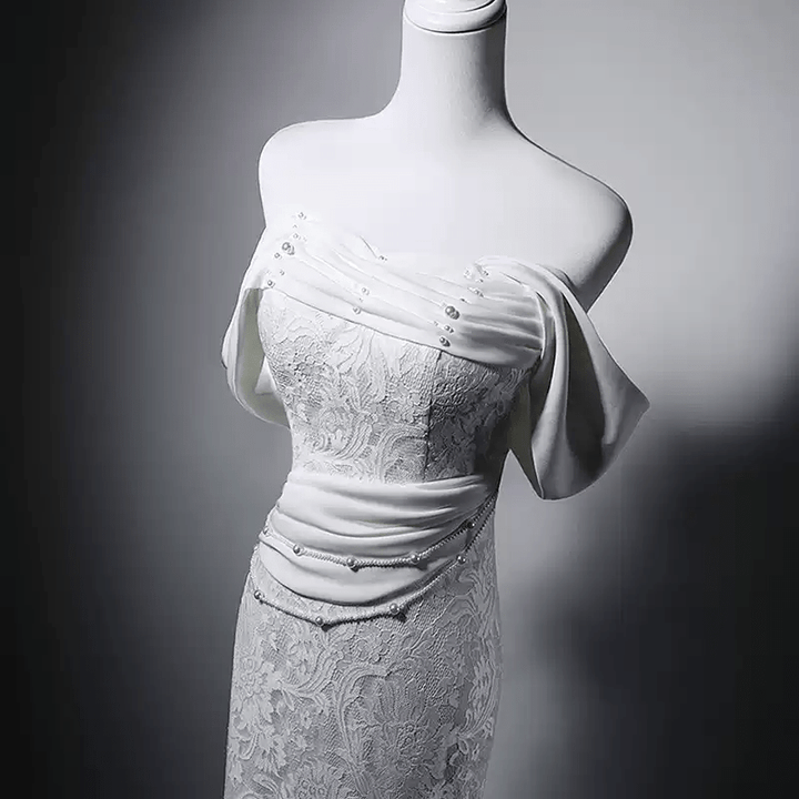 Unveil your inner elegance in our Elegant White Evening Dress with Lace, a breathtaking gown designed for those unforgettable moments. This exquisite dress features a charming off-shoulder silhouette that gracefully highlights your neckline and collarbone, creating a timelessly sophisticated look.