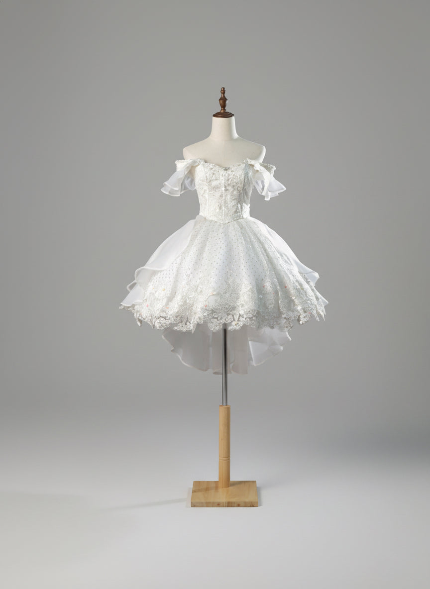 Embrace fairytale charm with this White Lolita off-shoulder short ball gown, designed to bring sweetness, elegance, and playful volume together in one enchanting silhouette. The structured bodice features delicate embroidery and pearl-accented trim, creating a refined yet dreamy look that flatters with gentle luxury. Soft ruffled off-shoulder sleeves add a romantic touch, while the voluminous skirt layers tulle and embroidered lace for a sparkling, princess-like glow.