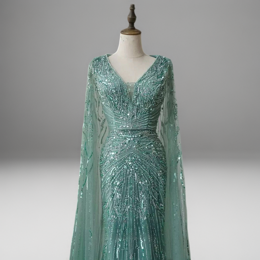 Crafted with meticulous detail, the gown features sculpted sequin embellishments that contour the body in radiant lines, creating a luminous, flattering silhouette. Sheer long sleeves extend into a dramatic train, offering the fluid elegance of a cape with the refinement of a gown. The soft mint green tone adds a refreshing, modern touch to this sparkly maxi dress, perfect for formal galas, high-profile celebrations, or red carpet moments.