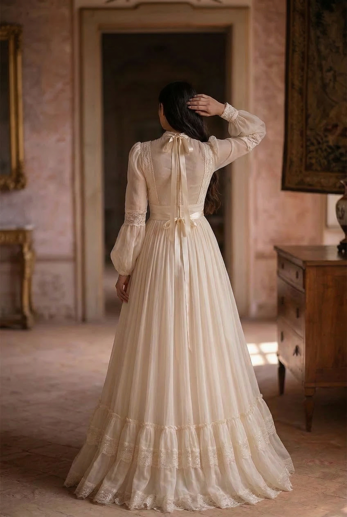 Inspired by the enduring spirit of Gunne Sax, this Victorian prairie bridal gown carries the innocence of 1970s romance while embracing modern craftsmanship.