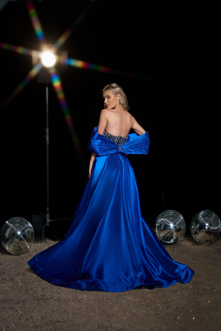 Dazzle with confidence in this hot pink strapless glitter dress with overskirt, the perfect blend of bold glamour and timeless sophistication. The shimmering sequined bodice sparkles beautifully, while the strapless sweetheart neckline enhances your silhouette with elegance. The dramatic overskirt creates a striking, regal effect, and the oversized bow detail at the back adds a charming, eye-catching touch to this stunning gown.