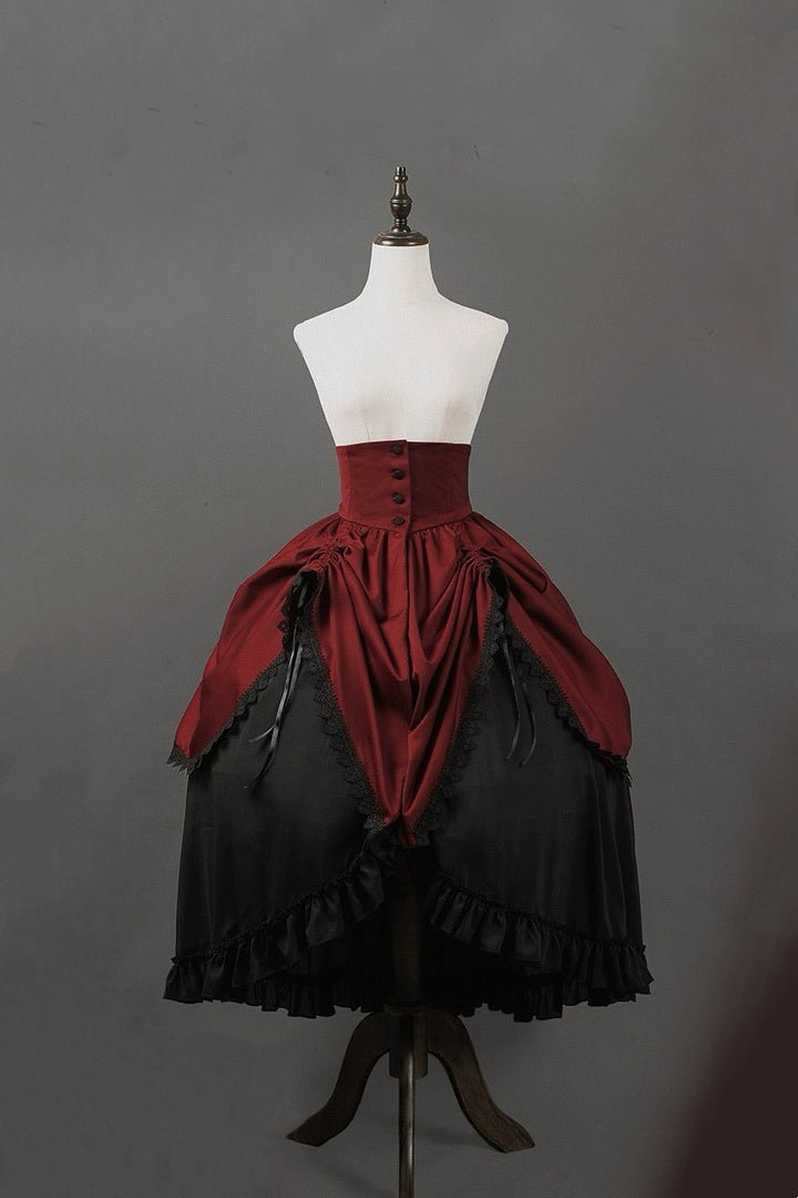 • Victorian Elegance: The combination of rich red and deep black fabrics, enhanced by delicate lace trimmings, captures the essence of Victorian sophistication and gothic charm.