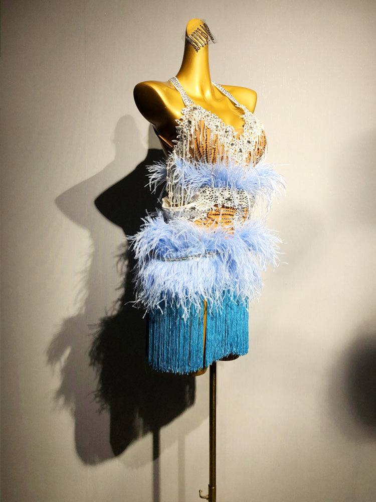 Blue Salsa Sequin Dress with Feather Trim and Fringe Skirt – Handmade Latin Ballroom Dance Costumes