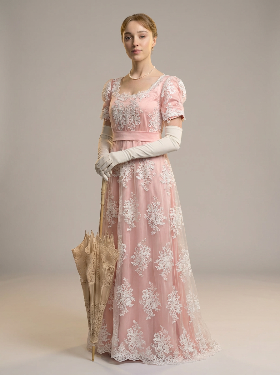 Regency Era Blush Pink Embroidered Empire Waist Vintage Gown – Bridgerton Inspired Lace Overlay Dress with Puff Sleeves Plus Size