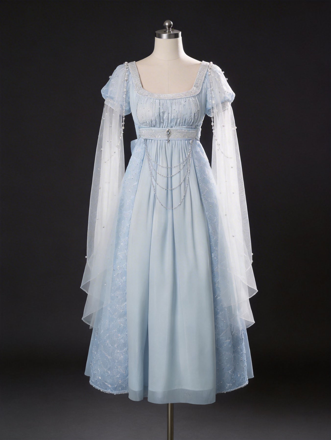 Step into soft historical elegance with this Regency Era blue lace empire waist vintage gown, inspired by early 19th-century European aristocratic silhouettes. The blue tone creates a warm, refined vintage presence, while the sheer lace overlay adds delicate texture and graceful movement. The empire waistline elongates the figure while keeping the classic Regency drape.